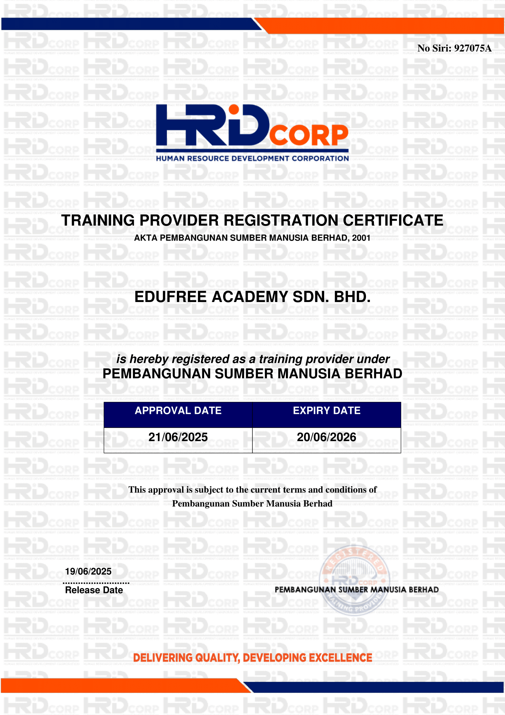 Kami adalah Penyedia Latihan yang berdaftar dengan HRD Corp.